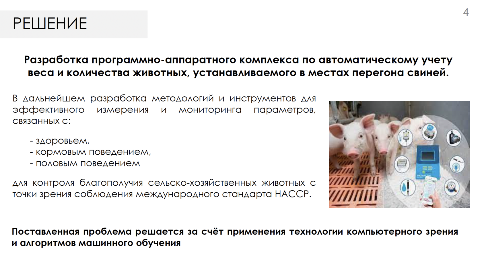Разработка программно-аппаратного комплекса по автоматическому учету веса и количества животных, устанавливаемая в местах перегона свиней.